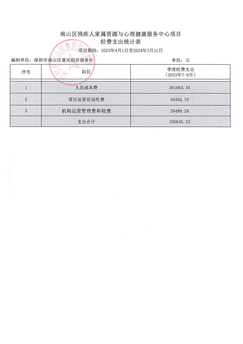 深圳市南山区残疾人家属资源与心理健康服务中心项目-季度经费支出(2023.7.1-2023.9.30)