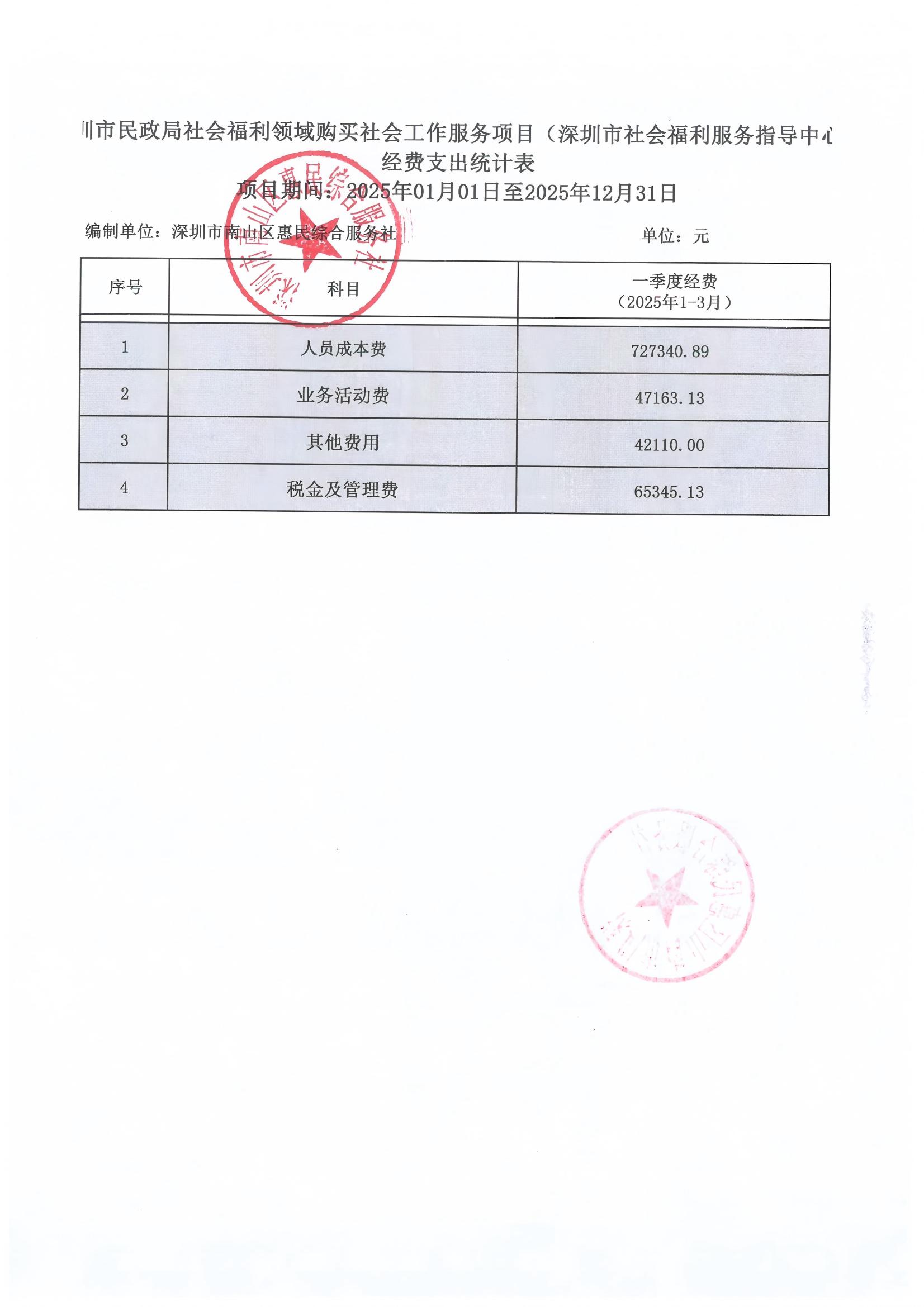 深圳市民政局社会福利领域购买社会工作服务项目(深圳市社会福利服务指导中心)经费支出统计-第一季度(2025年1-3月)