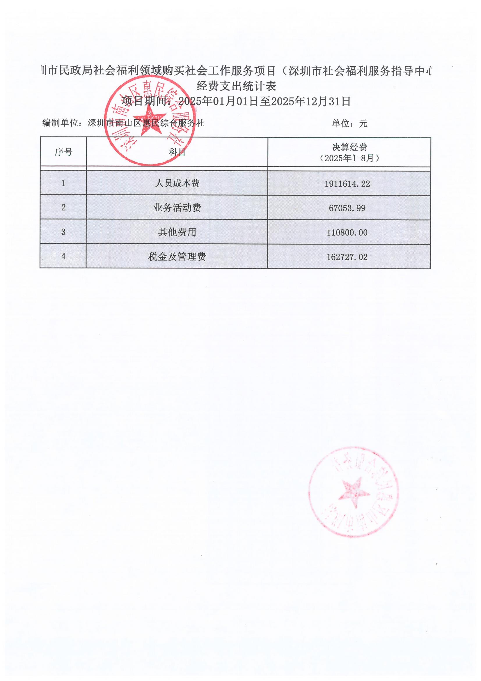 深圳市民政局社会福利领域购买社会工作服务项目(深圳市社会福利服务指导中心)经费支出统计-中期评估(2025年1-8月)