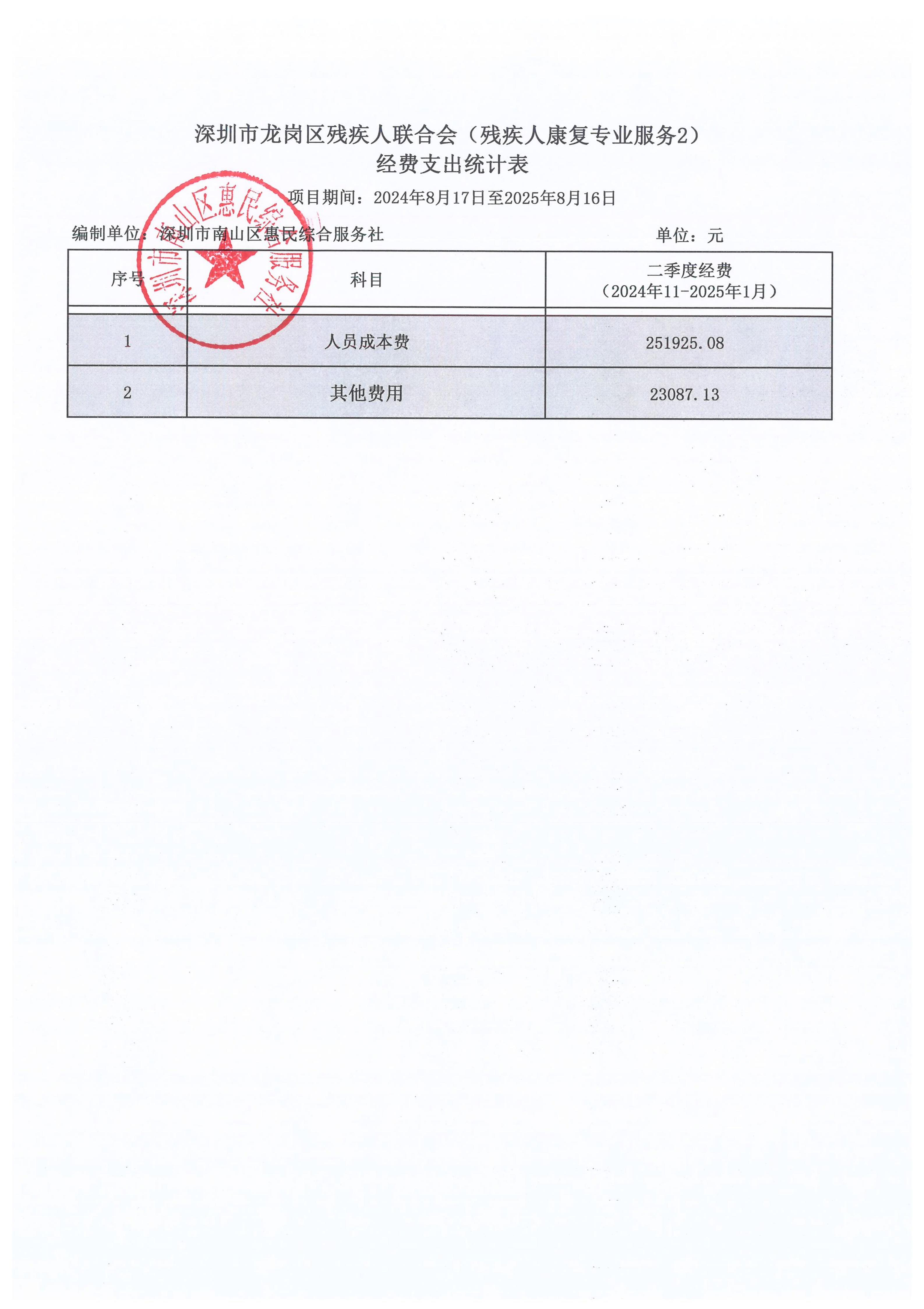 深圳市龙岗区残疾人联合会(残疾人康复专业服务2)经费支出统计 二季度经费 (2024年11-2025年1月)