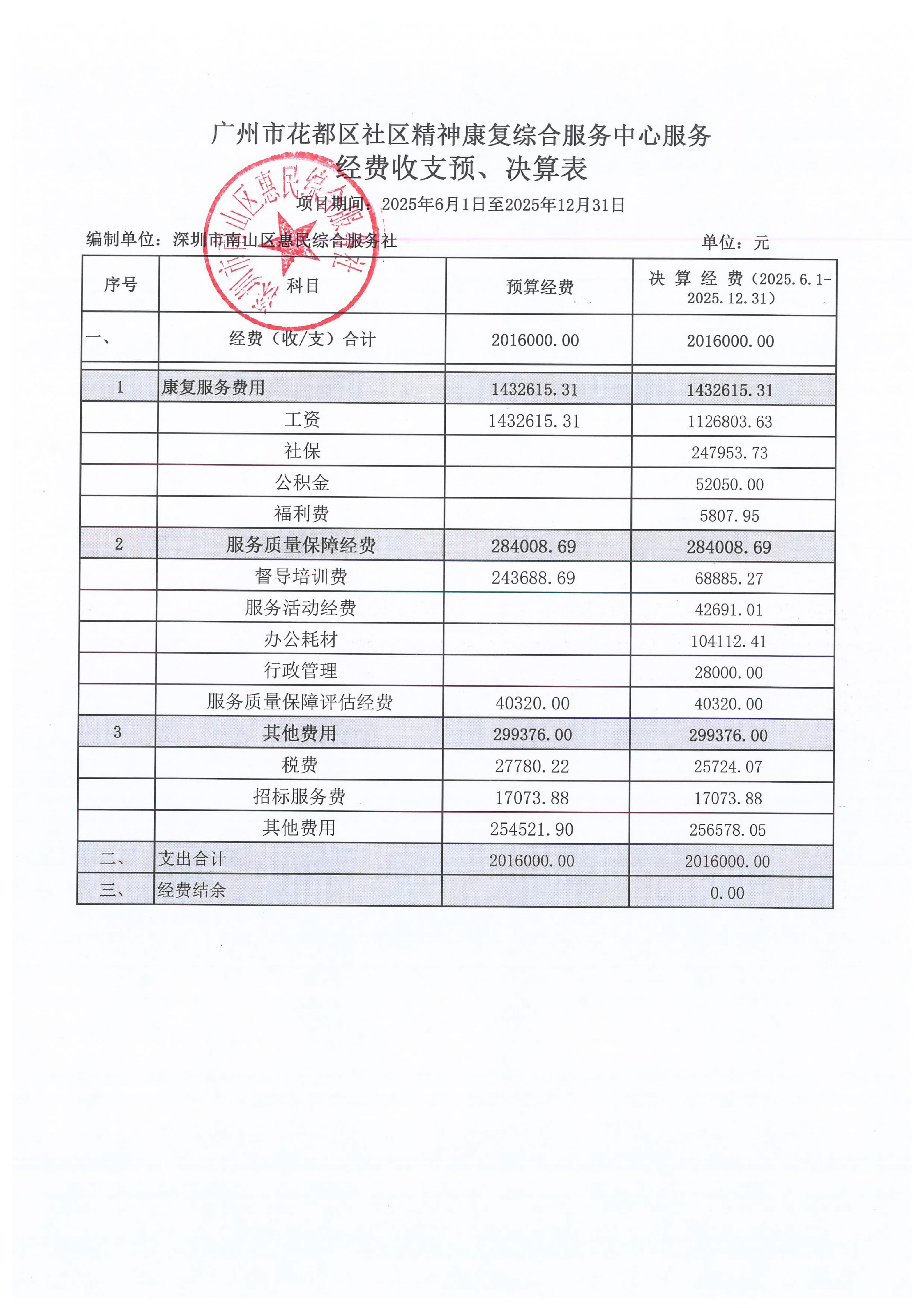 广州市花都区社区精神康复综合服务中心服务项目-经费支出统计-决算表(2025.6.1-2025.12.31)