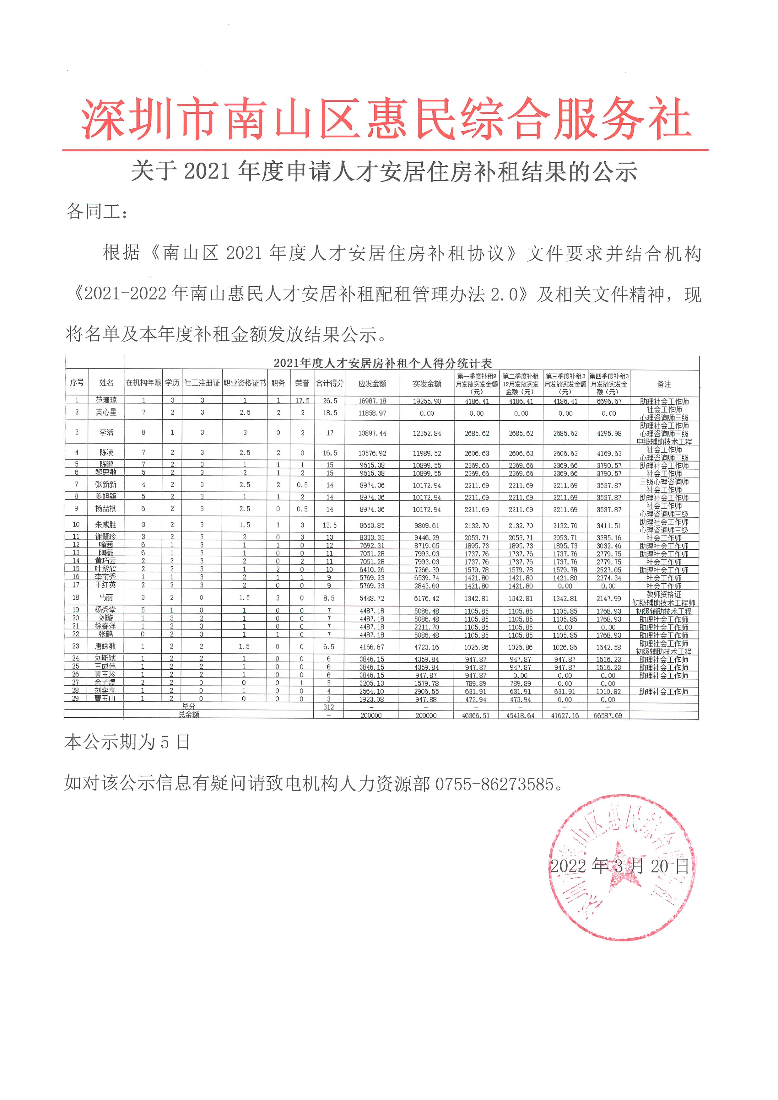关于2021年度人才安居住房补发放明细公示