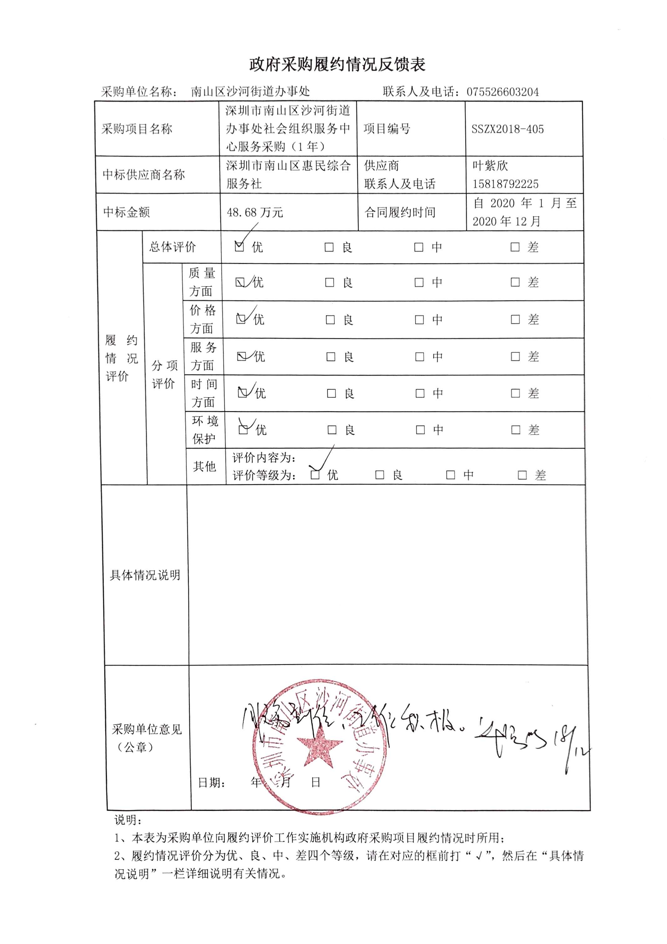 深圳市南山区沙河街道办事处街道社会组织服务中心履约评价(2020年)