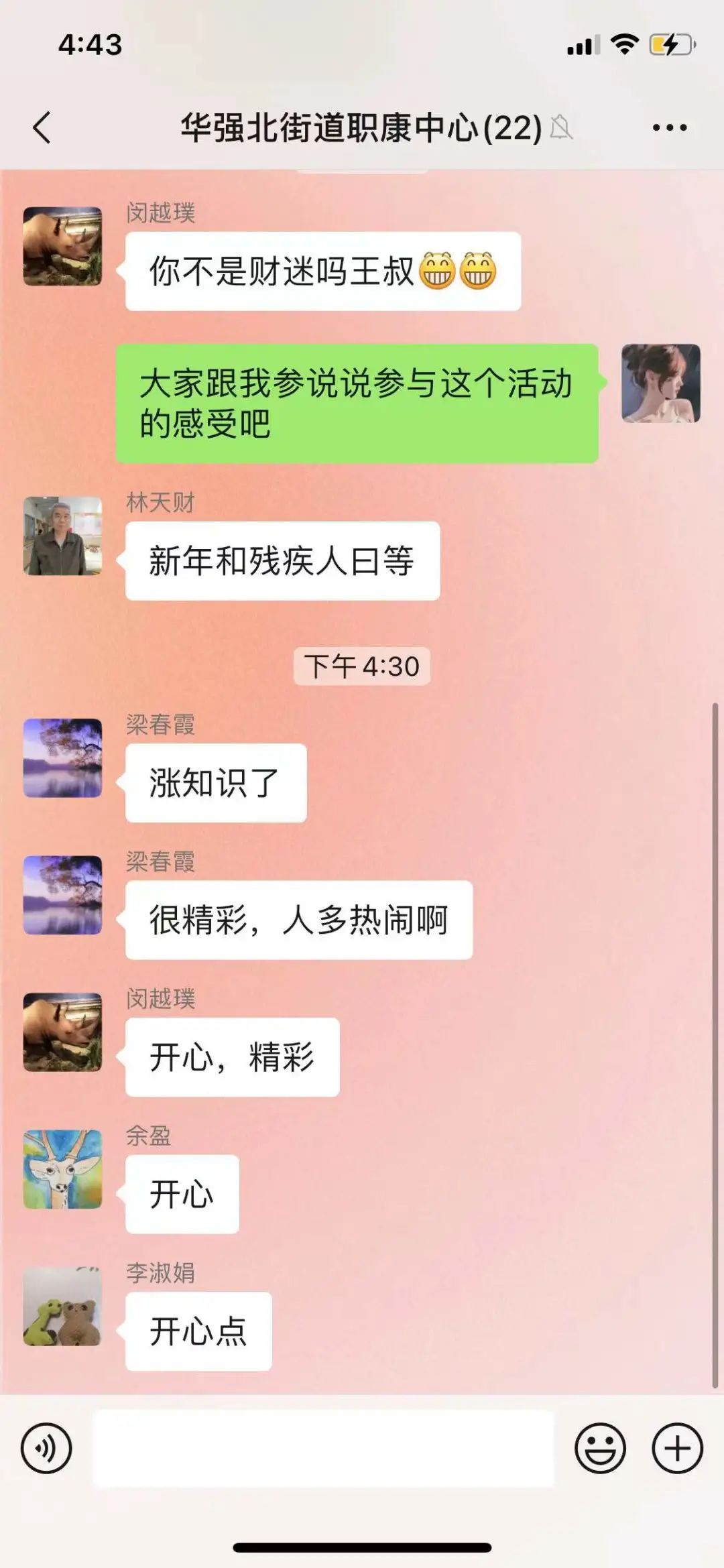 按照上级疫情防控及团队部门工作要求,部门积极动员康复人员参与社区防疫工作,在公众号、微信等播报文字及照片记录当日参与疫情的工作情况,及时跟踪参与防疫人员的心理动态。向工作人员及服务对象推送核酸检测点目录、防疫小技巧等工作,严格落实“五个一”措施,要求大家不信谣、不传谣、不参与公众聚餐和聚会,对亲友负责,对家人负责,筑牢打赢疫情防控狙击战。