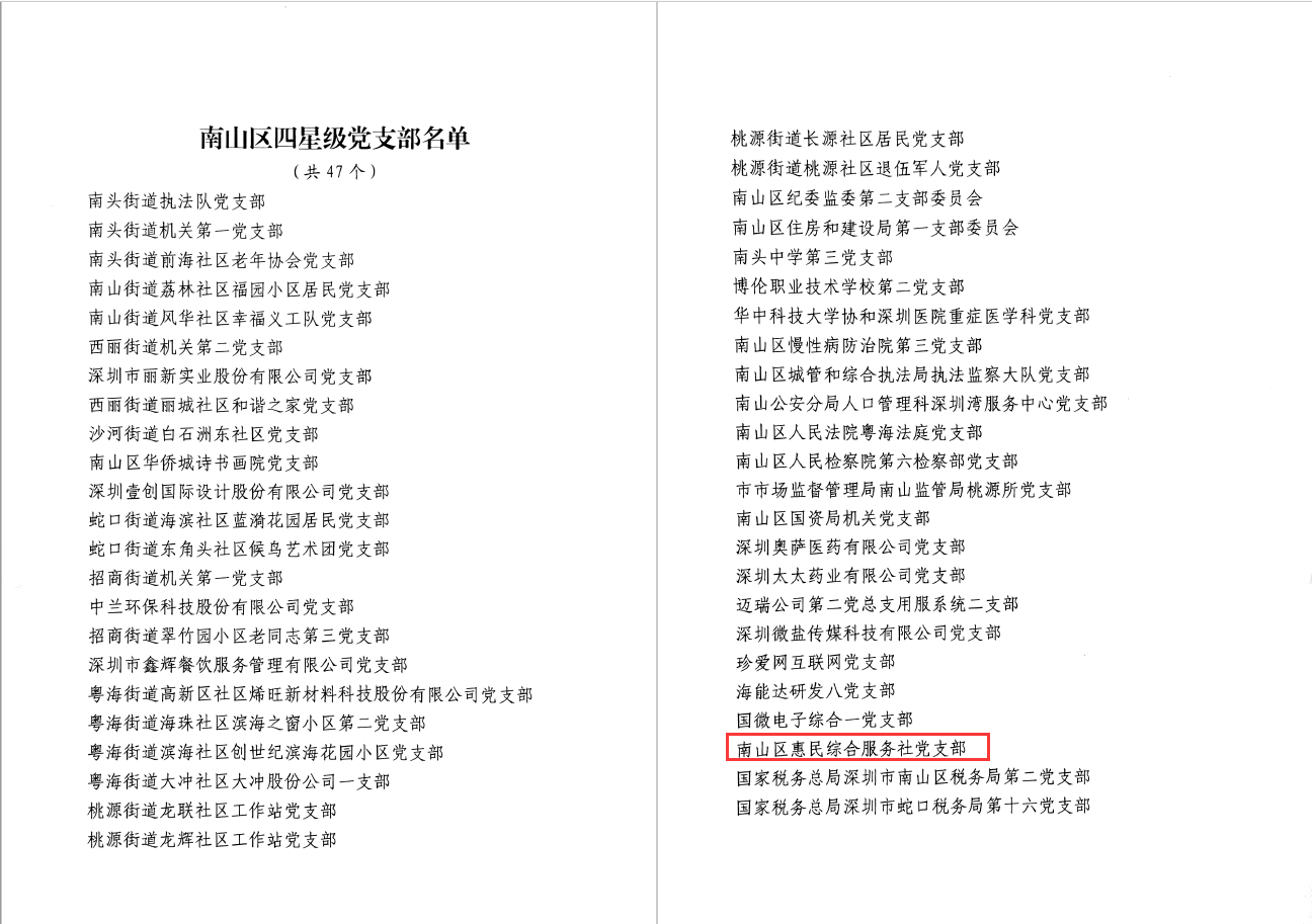 深圳市南山区惠民综合服务社党支部经过南山区委组织部的综合考核,被评定为南山区“四星级党支部”,这也是南山区第一批四星级党支部。