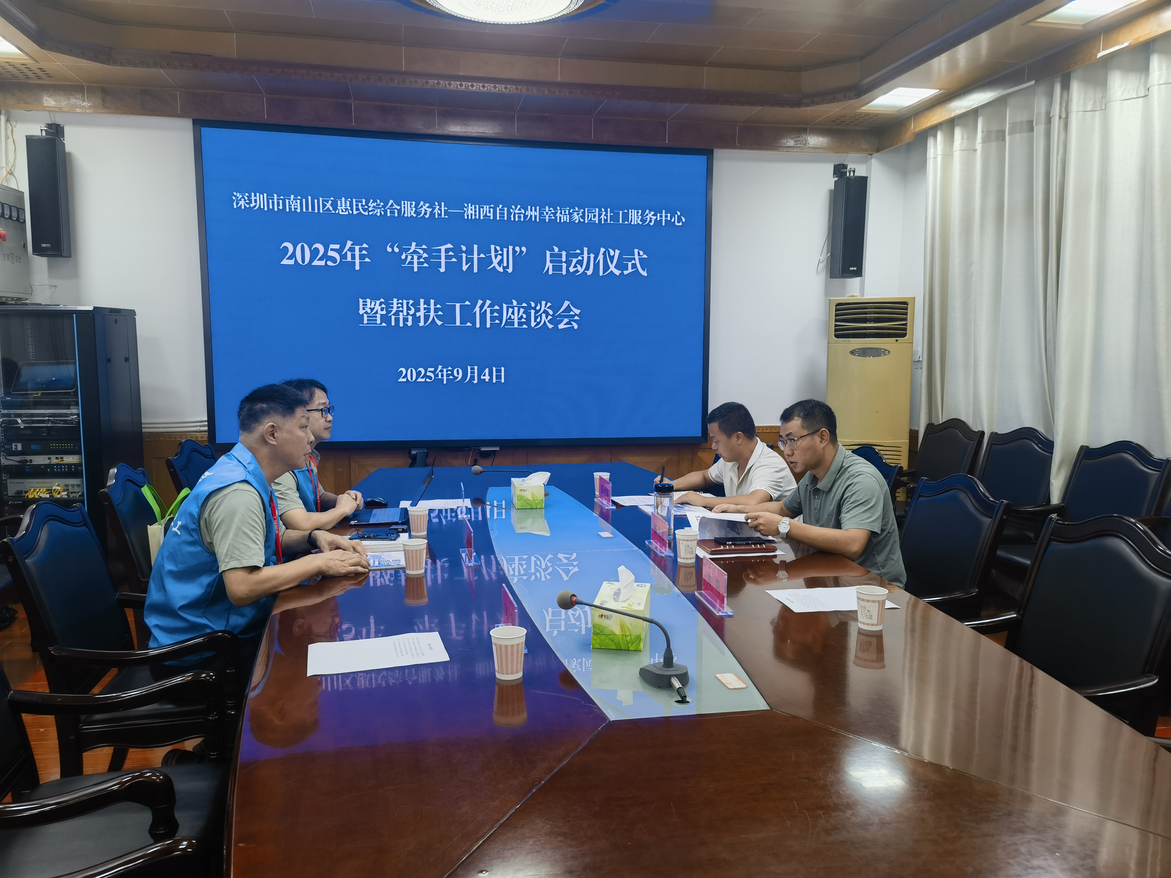 2025年9月4日上午,在湖南省湘西土家族苗族自治州委社会工作部会议室,“十四五”时期社会工作服务机构“牵手计划”2025年度启动仪式暨帮扶工作座谈会顺利开展。深圳市南山区惠民综合服务社(以下简称“南山惠民”)与湘西自治州幸福家园社工服务中心(以下简称“幸福家园”)再度牵手,标志着新一年度的对口支援与社会工作专业帮扶全面启动。