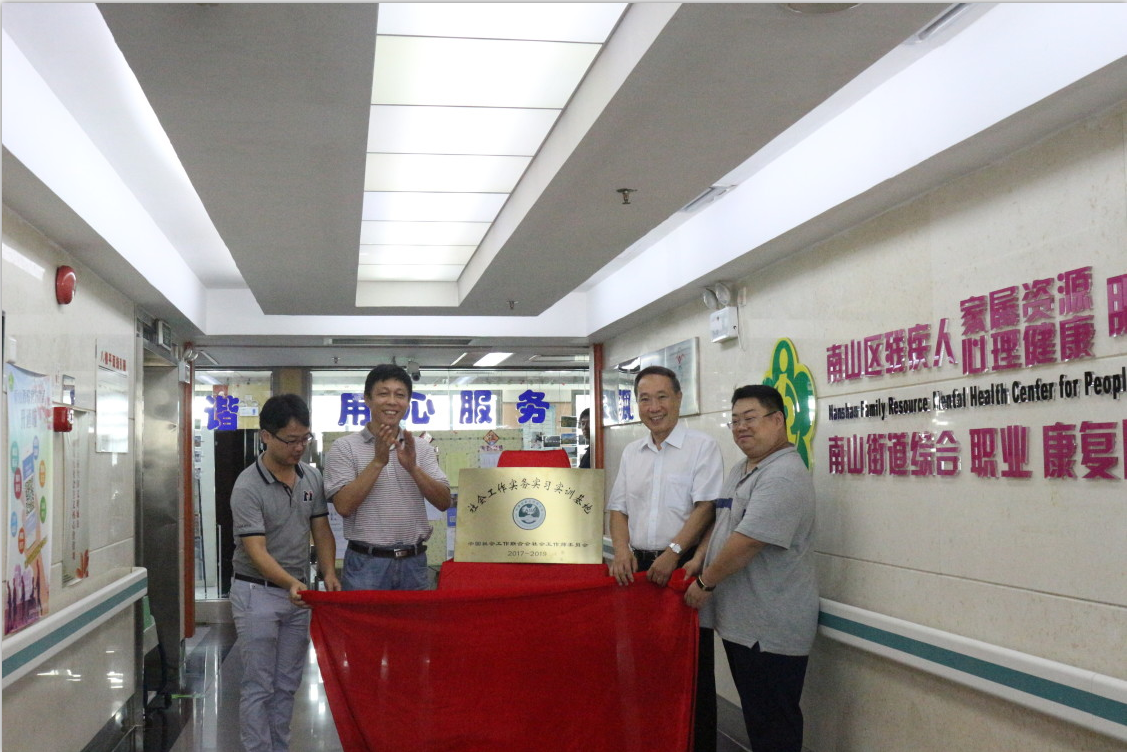 2017年9月27日下午,中国社会工作联合会副会长、社会工作师委员会主任孙建春和中国社工师委员会培训部部长胡剑在深圳市南山区惠民综合服务社总干事周湧的陪同下,莅临指导了由深圳市南山区残联购买服务、深圳市南山区惠民综合服务社运营的“南山区残疾人家属资源与心理健康服务中心”,并出席了惠民综合服务社“社会工作实务实习实训基地”的揭牌仪式。