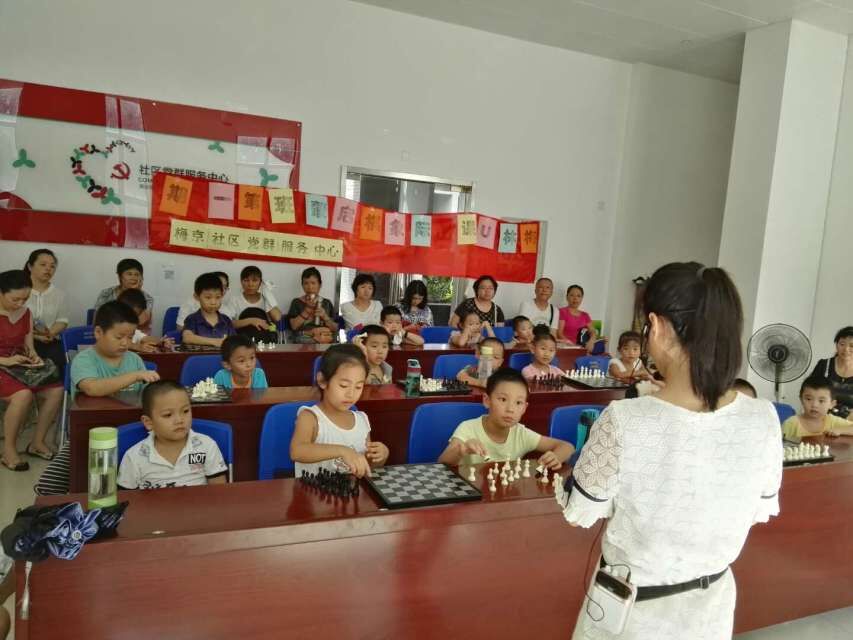 由梅林街道主办的公益U课程—国际象棋启蒙班,在梅京社区社工的协助之下,7月27号如期在梅京社区党群活动中心开课了。家长带着孩子早早地来到现场,充满期待地等待老师授课。